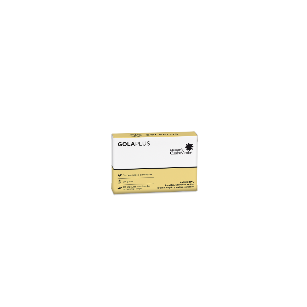 INDICADO PARA: RESFRIADO TOS DOLOR DE GARGANTA DEPURACIÓN, CONTAMINACIÓN, HUMO DEL TABACO DEFENSAS INMUNITARIAS AFONÍA 20 cápsulas masticables con tecnología softgel SABOR BALSÁMICO CÓMO TOMARLO 1-4 cápsulas masticables al día. INGREDIENTES Relleno: aceite de semillas de girasol, extracto seco de raíz de regaliz (Glycyrrhiza glabra L.) en maltodextrinas al 10 % en ácido glicirrícico, extracto seco de propóleo en goma arábiga y sacarosa, espesante: mono y diglicéridos de los ácidos grasos, zumo concentrado de planta equinácea [Echinacea purpurea (L.) Moench] en maltodextrinas, extracto seco de semillas de perilla (Perilla frutescens Britton) en trehalosa, Aloe vera (Aloe barbadensis Mill.) gel 200:1 en maltodextrinas, aceite esencial de fruto de anís verde (Pimpinella anisum L.), aceite esencial de sumidades de menta piperita (Mentha piperita L.), agente emulsionante: lecitina de soja; extracto seco de sumidades floridas de erísimo (Sisymbrium officinale Scop.) en matodextrinas. Envoltura: gelatina, agente de resistencia: glicerol; aroma: menta.